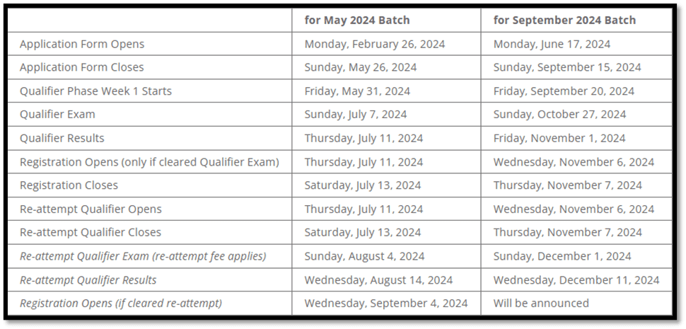 There are two batches: One in May and the other in September for an academic year. The application deadlines for this year are: